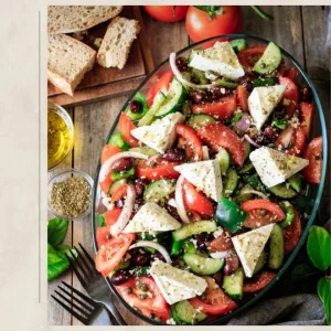 Feta, tomatoes, cucumber, red onion, green pepper, Kalamata olives, dolmas